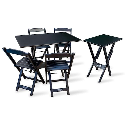Jogo De Mesa Dobrável 1,10x70 Com 4 Cadeiras E Mesa Aparador Tarimatã Para Area Gourmet - Pretoé ideal para bares, restaurantes, estabelecimentos, áreas de lazer e também para sua casa. Em madeira tornando-os resistentes e duráveis. Seu design permite que esse conjunto seja encaixado em qualquer ambiente, trazendo um toque a mais para seu estabelecimento. Além de sua durabilidade, o que lhe trará conforto para servir seus clientes. Por ser dobrável torna-se mais fácil guardar, manusear e limpar o produto.Atenção: EVITE USAR PRODUTOS ABRASIVOS E QUÍMICOS PARA LIMPEZA DO PRODUTO, aconselha-se o uso de pano umedecido para melhor conservação mantenha o produto fora de chuva e sol constantes.*imagens meramente ilustrativas*Medidas Mesa:Tampo 108,5 x 67,5 cmAltura 77cm Dimensões Cadeira:Altura da cadeira aberta 78cm Altura da cadeira fechada 89cm Altura até o assento 46cm Largura 41,5cm Largura vão do assento 37,5cm Profundidade 40cm Profundidade do assento 32cmMedidas Aparador:Tampo 67,5 x 43 cmAltura 77cmJogo de Mesa DobrÃvel 1,10x70 com 4 Cadeiras e Mesa Aparador Tarimatà para Area Gourmet - Preto
