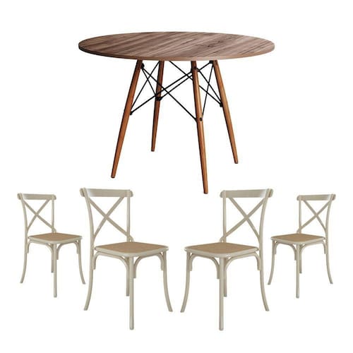 Jogo De Mesa Eiffel Redondo Tampo De Madeira 90cm Amêndoa Com 4 Cadeiras Katrina aço Off White Assento BegeA sua cozinha ou sala de jantar ficará completa com esse lindo Conjunto de Mesa e Cadeiras! Contendo um design de móveis moderno, elegante e com uma ousada combinação de cores, esse é um kit que certamente é uma solução que esbanja estilo, elegância e muito requinte.O conjunto tem em sua diversificada estrutura de materiais com altíssima qualidade, que proporciona muito mais resistência, mesmo com o passar dos anos, e com seus 4 assentos Katrina Aço é ideal para um jantar em família sem abrir mão do conforto. O Kit acompanha versatilidade e combina com vários tipos de decoração, o que dá mais praticidade em sua casa.Informações técnicas Conjunto:Conteúdo da Embalagem: 01 Mesa e 04 Cadeiras (Embalados Separadamente).Instruções/Cuidados: Limpar com pano seco ou levemente umedecido com água.Necessita de Montagem? Sim.Mesa:Modelo: Eiffel WoodTipo: RedondaCor do tampo: AmêndoaCor da base dos pés: Wood (Madeira)Material do tampo: MadeiraMaterial dos pés: MadeiraDimensões: Altura: 76 cm // Largura: 90 cm // Profundidade: 90 cmCadeiras:Modelo: KatrinaCor: Off White e BegeMaterial da estrutura: Aço com Pintura E-PoxMaterial do assento: Espuma D14 com Revestimento em Corano.Dimensões: Altura: 90 cm // Largura: 50 cm // Profundidade: 55 cmJogo de Mesa Eiffel Redondo Tampo de Madeira 90cm AmÃndoa com 4 Cadeiras Katrina Off White Assento B