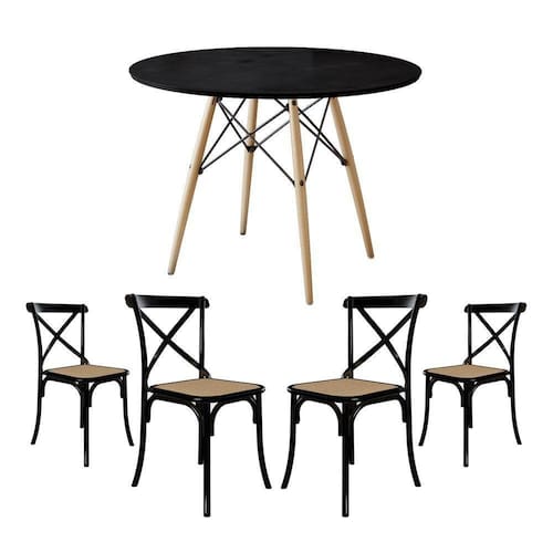 Jogo De Mesa Eiffel Redondo Tampo De Madeira 90cm Preto Com 4 Cadeiras Katrina aço Preto Assento BegeA sua cozinha ou sala de jantar ficará completa com esse lindo Conjunto de Mesa e Cadeiras! Contendo um design de móveis moderno, elegante e com uma ousada combinação de cores, esse é um kit que certamente é uma solução que esbanja estilo, elegância e muito requinte.O conjunto tem em sua diversificada estrutura de materiais com altíssima qualidade, que proporciona muito mais resistência, mesmo com o passar dos anos, e com seus 4 assentos Katrina Aço é ideal para um jantar em família sem abrir mão do conforto. O Kit acompanha versatilidade e combina com vários tipos de decoração, o que dá mais praticidade em sua casa.Informações técnicas Conjunto:Conteúdo da Embalagem: 01 Mesa e 04 Cadeiras (Embalados Separadamente).Instruções/Cuidados: Limpar com pano seco ou levemente umedecido com água.Necessita de Montagem? Sim.Mesa:Modelo: Eiffel WoodTipo: RedondaCor do tampo: PretoCor da base dos pés: Wood (Madeira)Material do tampo: MadeiraMaterial dos pés: MadeiraDimensões: Altura: 76 cm // Largura: 90 cm // Profundidade: 90 cmCadeiras:Modelo: KatrinaCor: Preta e BegeMaterial da estrutura: Aço com Pintura E-PoxMaterial do assento: Espuma D14 com Revestimento em Corano.Dimensões: Altura: 90 cm // Largura: 50 cm // Profundidade: 55 cmJogo de Mesa Eiffel Redondo Tampo de Madeira 90cm Preto com 4 Cadeiras Katrina Preto Assento Bege