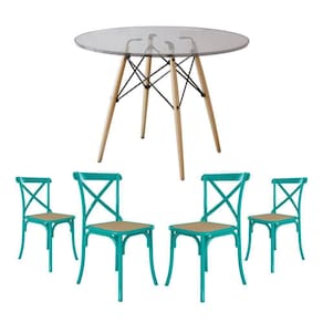 Jogo De Mesa Eiffel Redondo Tampo De Vidro 110cm Com 4 Cadeiras Katrina Azul Turquesa Assento Bege
