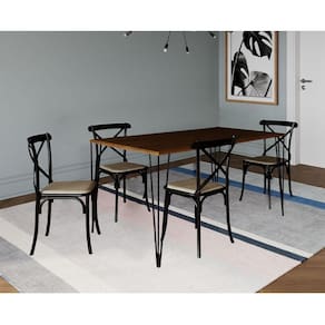 Jogo De Mesa Elen Retangular Tampo De Madeira 140x80cm Amêndoa Com 4 Cadeiras Katrina Preto AssentoA sua cozinha ou sala de jantar ficará completa com esse lindo Conjunto de Mesa e Cadeiras! Contendo um design de móveis moderno, elegante e com uma ousada combinação de cores, esse é um kit que certamente é uma solução que esbanja estilo, elegância e muito requinte.O conjunto tem em sua diversificada estrutura de materiais com altíssima qualidade, que proporciona muito mais resistência, mesmo com o passar dos anos, e com seus 4 assentos Katrina Aço é ideal para um jantar em família sem abrir mão do conforto. O Kit acompanha versatilidade e combina com vários tipos de decoração, o que dá mais praticidade em sua casa sem abrir mão de um espaço a mais na mesa.Informações técnicas Conjunto:Conteúdo da Embalagem: 01 Mesa e 04 Cadeiras (Embalados Separadamente).Instruções/Cuidados: Limpar com pano seco ou levemente umedecido com água.Necessita de Montagem? Sim.Mesa:Modelo: ElenTipo: RetangularCor do tampo: Amêndoa Cor da base dos pés: PretoMaterial do tampo: Madeira Dimensões: Altura: 76 cm // Largura: 140 cm // Profundidade: 80 cmCadeiras:Modelo: KatrinaCor: Preta e BegeMaterial da estrutura: Aço com Pintura E-PoxMaterial do assento: Espuma D14 com Revestimento em Corano.Dimensões: Altura: 90 cm // Largura: 50 cm // Profundidade: 55 cmJogo de Mesa Elen Retangular Tampo de Madeira 140x80cm AmÃndoa com 4 Cadeiras Katrina Preto Assento