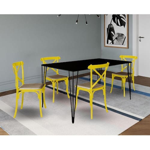 Jogo De Mesa Elen Retangular Tampo De Madeira 140x80cm Preto Com 4 Cadeiras Katrina Amarela Assento - Cor: Preto