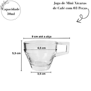 Informações Técnicas: Composição: Vidro. Altura da xícara: 5,5cm. Diâmetro superior: 6,5cm. Capacidade de cada xícara: 30ml. Peso de cada xícara: 112 gramas.
