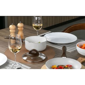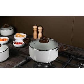 DIFERENCIAL: O Jogo de Panelas Brinox Antiaderente possui estrutura em alumínio, facilitando o cozimento uniforme.. Revestimento cerâmico não deixa o alimento grudar, facilita a limpeza e é livre de metais pesados e elementos prejudiciais a saúde (PFOA free).. ANTIADERENTE: O revestimento cerâmico não deixa o alimento grudar, permitindo o uso de menos óleo facilitando a limpeza e é livre de metais pesados, e elementos prejudiciais a saúde (PFOA free), por isso possui classificação A (ótima) no Inmetro.. No jogo, as panelas e caçarolas possuem antiaderente Pro Ceramic Premium e a frigideira do conjunto possui o revestimento Mineral Resist com partículas de cerâmica ultra resistente ao uso em altas temperaturas.. COMPOSIÇÃO: 01 Caçarola Indução Brinox com Tampa - Diâmetro: 22 cm.. Altura:10,5 cm.. Capacidade: 3,55 litros; 01 Caçarola Indução Brinox com Tampa - Diâmetro: 20 cm | Altura: 9,5 cm.. Capacidade: 2,55 litros; 01 Panela Indução Brinox com Tampa- Diâmetro: 18 cm | Altura: 9 cm | Capacidade: 1,55 litros; 01 Panela Indução Brinox com Tampa - Diâmetro: 16 cm | Altura: 8 cm | Capacidade: 1,25 Litros; 01 FrigideiraIndução Brinox - Diâmetro: 22 cm | Altura: 4,5 cm | Capacidade: 1,1 litros. A espessura dos produtos é de 2,5 mm..