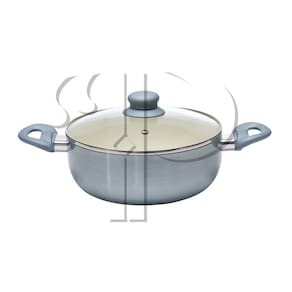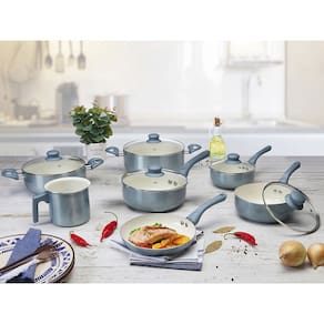 Jogo Panelas com 7 peças Modelo Genebra Baccani Composto por 1 Fervedor, 1 Frigideira, 3 panelas e 2 Caçarolas Cor Azul Metalizado com interno antiaderente cerâmico na cor creme. Livre dos os componentes PTFE e PFOA prejudiciais à saúde Servem para fogões à gás e elétrico. Não servem para fogões à indução Alumínio com Espessura 1,8mm Revestimento Antiaderente Cerâmico na cor creme. Não Gruda. Cabos e alças siliconadas resistentes ao calor Tampas em Vidro Temperado com saída de vapor e bordas em aço inoxidável. Fácil de limpar e podem ir à lava-louças