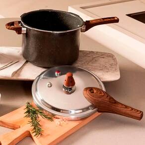 O conjunto de Panela de Pressão e Frigideiras da Brinox, conta com estrutura de alumínio com revestimento cerâmico que cozinha os alimentos por igual e mais rápido, dissipando melhor o calor, proporcionando um maior aproveitamento de nutrientes dos alimentos. A tampa com fechamento externo torna a panela mais segura que as convencionais, pois possui trava de abertura, que impede que a panela seja aberta se houver pressão no cabo da tampa. No total são 4 dispositivos de segurança, sendo uma trava do cabo, duas válvulas de trabalho e um escape de segurança A parte externa possui pintura na cor granito tornando a peça bem versátil para completar sua cozinha, já a parte interna é feita em revestimento antiaderente cerâmico Pro Ceramic Premium com classificação A do Inmetro, não gruda, é mais fácil de limpar e mais saudável, pois necessita de menos óleo para o cozimento e é livre de PFOA. Seu cabo e alça são feitos em baquelite soft-touch com design amadeirado, dando um toque macio e proporcionando mais segurança, conforto e melhor manuseio, pois não esquentam.