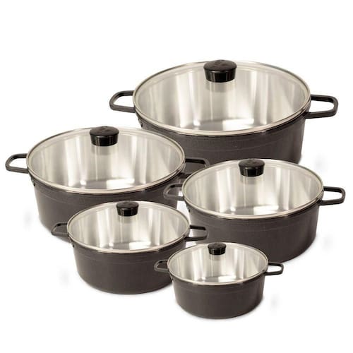 Panela Fundida Alumínio Batido Caçarolas 5 Peças Tampa de Vidro são duráveis e eficientes, apresentando alto desempenho no preparo de suas receitas. O calor distribuído por toda a superfície e não somente no fundo faz com que o alimento cozinhe de maneira uniforme, conservando suas propriedades e nutrientes. Pode ser usada em fogão a gás ou a lenha. Um material altamente resistente ao calor e ao impacto, tornando-a 10 vezes mais resistente que uma frigideira comum. Dicas de uso: Manuseá-la utilizando o cabo e luvas para proteção das mãos. Para limpeza utilizar detergente neutro e esponjas não abrasivas, não utilizar objetos que possam danificar.