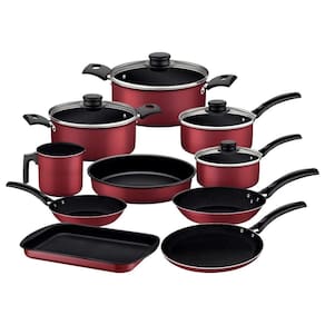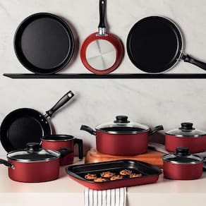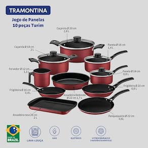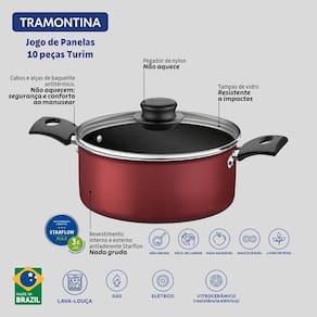 Características Principais: Marca: Tramontina Modelo: Turim Material da Panela: Alumínio Material da Tampa: Vidro e Aço Inox Revestimento: Starflon Antiaderente Quantidade de Pecas: 10 Cor: Vermelho EAN: 7891112319974