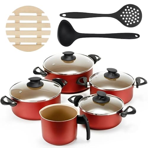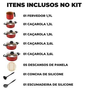 01 Caçarola 16cm 01 Caçarola 18cm 01 Caçarola 20cm 01 Caçarola 22cm 01 Fervedor 14cm 05 Descansos de Panela 01 Concha de Silicone 01 Escumadeira de Silicone Marca: Não Informado Ean: 7894141427450