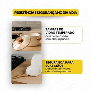O Jogo de Panelas Brinovar Vanilla 7 Peças + 3 Utensílios combina design moderno, praticidade e resistência. Feitas em alumínio com revestimento cerâmico tripla camada, oferecem cozimento uniforme, alimentos sem grudar e limpeza rápida. Compatíveis com todos os fogões gás, elétrico, vitrocerâmico e indução , contam com tampas de vidro temperado e cabos antitérmicos para mais segurança. Saudáveis e livres de PFOA, preservam o sabor natural dos alimentos. Especificações Técnicas Material: Alumínio com revestimento cerâmico tripla camada antiaderente . Tampas: Vidro temperado com saída de vapor. Cabos, Alças e Pegadores: Baquelite antitérmico com revestimento soft touch Acessórios: 3 Colheres de pau de bambu Cor: Vanilla bege claro elegante . Compatibilidade: Fogões a gás, elétrico, vitrocerâmico e indução. Segurança: Livre de PFOA. : 90 dias Conteúdo da embalagem: 01 Panela: Capacidade: 1,3 Litros Diâmetro: 16 cm Altura: 8,5 cm 01 Panela: Capacidade: 2,25 Litros Diâmetro: 20 cm Altura: 9 cm 01 Caçarola: Capacidade: 2,25 Litros Diâmetro: 20 cm Altura: 9 cm 01 Caçarola: Capacidade: 3,8 Litros Diâmetro: 24 cm Altura: 10,5 cm 01 Frigideira: Capacidade: 0,75 Litros Diâmetro: 18 cm Altura: 4,3 cm 01 Frigideira: Capacidade: 1,6 Litros Diâmetro: 24 cm Altura: 4,9 cm 01 Leiteira: Capacidade útil: 1,5 Litros Diâmetro: 14 cm Altura: 10 cm 03 Colheres de Pau de Bambu: Tamanho: 6,5 30 cm Instruções de uso e conservação: Antes do primeiro uso, lave com esponja macia, enxágue e seque bem. Depois da primeira lavagem, faça a cura: unte a parte interna com óleo, aqueça em fogo baixo, deixe esfriar, descarte o conteúdo e lave novamente.