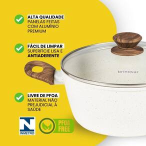 O Jogo de Panelas Brinovar Vanilla 7 Peças + 3 Utensílios combina design moderno, praticidade e resistência. Feitas em alumínio com revestimento cerâmico tripla camada, oferecem cozimento uniforme, alimentos sem grudar e limpeza rápida. Compatíveis com todos os fogões gás, elétrico, vitrocerâmico e indução , contam com tampas de vidro temperado e cabos antitérmicos para mais segurança. Saudáveis e livres de PFOA, preservam o sabor natural dos alimentos. Especificações Técnicas Material: Alumínio com revestimento cerâmico tripla camada antiaderente . Tampas: Vidro temperado com saída de vapor. Cabos, Alças e Pegadores: Baquelite antitérmico com revestimento soft touch Acessórios: 3 Colheres de pau de bambu Cor: Vanilla bege claro elegante . Compatibilidade: Fogões a gás, elétrico, vitrocerâmico e indução. Segurança: Livre de PFOA. : 90 dias Conteúdo da embalagem: 01 Panela: Capacidade: 1,3 Litros Diâmetro: 16 cm Altura: 8,5 cm 01 Panela: Capacidade: 2,25 Litros Diâmetro: 20 cm Altura: 9 cm 01 Caçarola: Capacidade: 2,25 Litros Diâmetro: 20 cm Altura: 9 cm 01 Caçarola: Capacidade: 3,8 Litros Diâmetro: 24 cm Altura: 10,5 cm 01 Frigideira: Capacidade: 0,75 Litros Diâmetro: 18 cm Altura: 4,3 cm 01 Frigideira: Capacidade: 1,6 Litros Diâmetro: 24 cm Altura: 4,9 cm 01 Leiteira: Capacidade útil: 1,5 Litros Diâmetro: 14 cm Altura: 10 cm 03 Colheres de Pau de Bambu: Tamanho: 6,5 30 cm Instruções de uso e conservação: Antes do primeiro uso, lave com esponja macia, enxágue e seque bem. Depois da primeira lavagem, faça a cura: unte a parte interna com óleo, aqueça em fogo baixo, deixe esfriar, descarte o conteúdo e lave novamente.