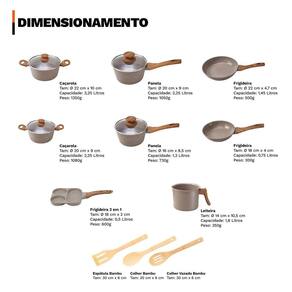 Distribuído por feheros shop Jogo de panelas 11 peças premium indução revestimento cerâmico Atenção As panelas com revestimento cerâmico oferecem propriedades antiaderentes, mas não são 100% antiaderentes. Para melhores resultados, recomenda-se o uso de pequenas quantidades de óleo ou . O revestimento cerâmico é uma alternativa saudável e ecológica, pois não libera substâncias tóxicas quando aquecido. - panelas premium com certificação inmetro nível a - não deixe a chama do fogão pegar nas laterais das panelas - leia atentamente a descrição e siga as recomendações do fabricante Informações do produto - versatilidade incrível: compatível com fogões a gás, elétrico, vitrocerâmico e de indução - durabilidade excepcional: revestimento cerâmico resistente a arranhões e abrasões - cozinha saudável: livre de pfoa e ptfe, ideal para quem busca mais saúde - design premium: acabamento moderno e elegante que facilita a limpeza - economia de tempo e energia: aquece rápido e distribui o calor de forma uniforme - conjunto completo: 11 peças para preparar diversas receitas com praticidade Especificações técnicas - compatível com fogões a gás, elétricos, vitrocerâmicos e de indução - revestimento cerâmico em 3 camadas com espessura de 4 mm - cabo de baquelite com revestimento soft touch, confortável e seguro - permite cozinhar com menos óleo graças ao revestimento antiaderente cerâmico - livre de pfoa e classificado como nível a no inmetro - fundo triplo com indução: estrutura em alumínio com cerâmica, economia de energia - composição de revestimento: 2 camadas cerâmicas + 1 camada resistente a alta temperatura Ficha técnica do produto - panela 16 cm: d 16 cm x a 8,5 cm c 1300 ml p 730 g - panela 20 cm: d 20 cm x a 9 cm c 2250 ml p 1050 g - caçarola 20 cm: d 20 cm x a 9 cm c 2250 ml p 1080 g - caçarola 22 cm: d 22 cm x a 10 cm c 3250 ml p 1350 g - leiteira 14 cm: d 14 cm x a 10,5 cm c 2000 ml p 350 g - frigideira 18 cm: d 18 cm x a 4 cm c 750 ml p 300 g - frigideira 22 cm: d 22 cm x a 4,7 cm c 1450 ml p 500 g - frigideira grill 3 em 1: 18 x 18 cm x a 2 cm p 600 g - espátula vazada de bambu: 30 x 6 x 1 cm - colher vazada de bambu: 30 x 6 x 1 cm - colher para arroz de bambu: 30 x 6 x 1 cm Importante: d= diâmetro, a= altura, c= capacidade, p= peso Antes do primeiro uso - lave com esponja macia e detergente - seque com pano de prato - aplique um pouco de óleo na parte interna - leve ao fogo baixo por 2 minutos - desligue o fogo e espere esfriar - lave novamente e seque Após o uso - evite choques térmicos. Deixe esfriar antes de lavar - lave à mão com água morna, esponja macia e detergente - enxágue e seque com pano macio - para alimentos queimados, deixe de molho e use materiais não abrasivos - não utilize utensílios metálicos, objetos afiados ou produtos abrasivos Itens inclusos no pacote - 01 panela 16 cm 1,3 l com tampa de vidro - 01 panela 20 cm 2,25 l com tampa de vidro - 01 caçarola 20 cm 2,25 l com tampa de vidro - 01 caçarola 22 cm 3,25 l com tampa de vidro - 01 leiteira 14 cm 2 l - 01 frigideira 18 cm 0,75 l - 01 frigideira 22 cm 1,45 l - 01 frigideira grill 3 em 1 - 01 espátula vazada de bambu - 01 colher vazada de bambu - 01 colher para arroz de bambu Todas as fotos são reais dos produtos. Qualquer dúvida, estamos à disposição 01- o produto pode ir ao forno R: não, estes modelos não são adequados para uso no forno devido ao cabo em baquelite. 02- o produto é novo Possui R: sim, o produto é novo e possui de 3 meses conforme as normas do fabricante. 03- é compatível com fogão de indução R: sim, possuem fundo especial que permite o uso em fogões de indução, além de fogões a gás, elétricos e vitrocerâmicos.