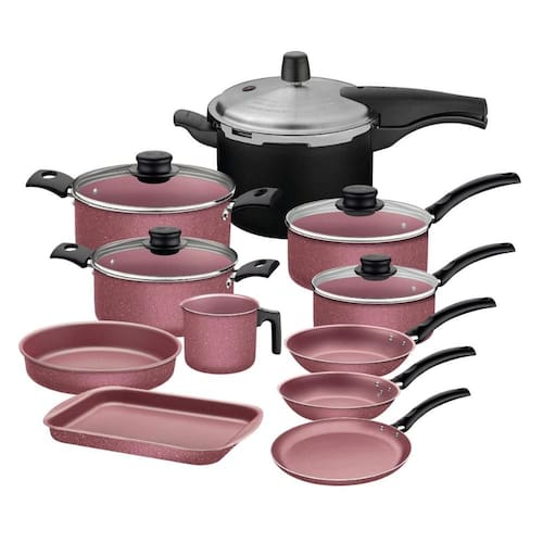 Seja qual for a receita que você vai preparar, é essencial contar com itens de qualidade, como o jogo de panelas Tramontina Turim e a Panela de Pressão Vancouver em alumínio com revestimento interno e externo em antiaderente Starflon Max. Aptas para uso no dia a dia, suas peças garantem maior segurança e facilidade na hora preparar suas refeições, pois contam com cabos, alças e pegadores em baquelite e nylon e vem com tampas de vidro temperado com borda de aço inox. Você ainda cozinha de maneira rápida e uniforme, sem que os alimentos grudem em sua superfície e tem facilidade na limpeza, pois o corpo das peças tem produção em alumínio com revestimento em antiaderente Starflon Max. Escolha Tramontina e deixe suas tarefas na cozinha, ainda melhores!