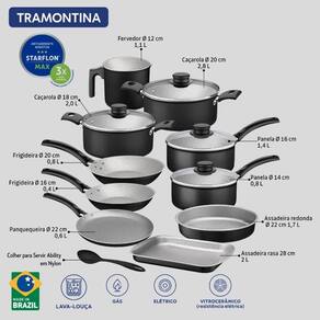 Cor: Preto | Marca: Tramontina | Fabricante: Tramontina | Origem: | Modelo: Jogo De Panelas 11 Peças | Condição do Item: | É Kit: Sim | É apto para lava-louças: Sim | Material do cabo: Baquelite antitérmico | Código universal de produto: 7891112332980 | Linha: Turim e Ability | Regulamentação Produto Perigoso: Não aplicável | SELLER_PACKAGE_HEIGHT: 52 cm | SELLER_PACKAGE_WIDTH: 37 cm | SELLER_PACKAGE_LENGTH: 26 cm | SELLER_PACKAGE_WEIGHT: 5000 g | SELLER_PACKAGE_TYPE: Caixa | Quantidade de peças: 11 | Adequado para fogão de indução: Não | É kit de : Não | EAN: 7891112332980