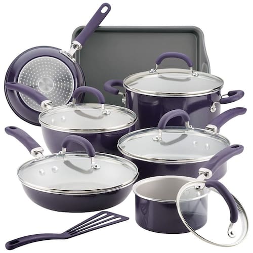 O CONJUNTO DE COZINHAS ANTIADERENTE INCLUI: Panela de 1,5 litros com tampa, Panela de 3 L com tampa, Panela de 6 L com tampa, Frigideira funda de 21,6 centímetros, Frigideira profunda de 26 centímetros, Panela refogada de 3 L com tampa, Espátula de 24,5 centímetros, forma de biscoitos de 23 x 33 centimetros.
