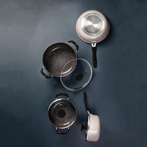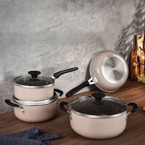 - Composição do Jogo: 1 Panela com tampa 18 cm (capacidade aproximada: 2,0 L), 1 Caçarola com tampa 20 cm (capacidade aproximada: 2,8 L), 1 Caçarola com tampa 24 cm (capacidade aproximada: 4,7 L), 1 Frigideira funda 24 cm (capacidade aproximada: 2,2 L);
