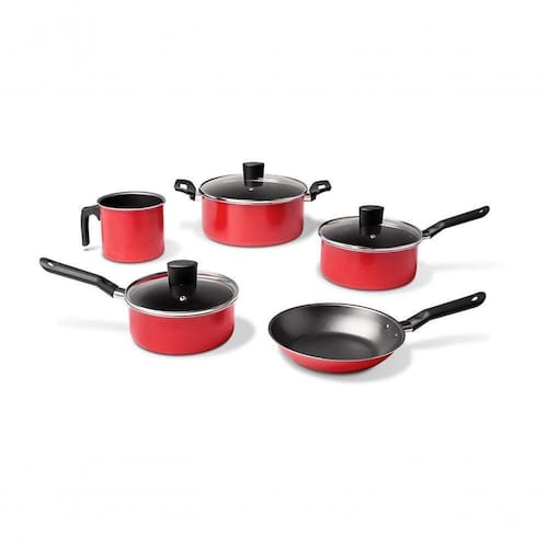 Com estrutura de alumínio que dissipa melhor o calor, cozinhando o alimento por igual, o conjunto de panelas é composto por 5 peças: uma caçarola com tampa 22x10 e 3,4 litros , duas panelas com tampa de 18x8 e 1,75 litro e 16x7 cm e 1,2 litro, uma frigideira de 20x4cm e 0,8 litro e um fervedor de 12x11,5cm e 1,2 litro. O revestimento interno é antiaderente, não deixando o alimento grudar, mesmo com uso reduzido de óleo o que torna a limpeza mais fácil. Os cabos de baquelite não aquecem, tornando o manuseio dos utensílios mais fácil e seguro. As caçarolas e panelas, disponíveis na cor vermelho, ainda possuem tampa de vidro temperado com saída para o vapor. O ciclo de vida do produto pode variar conforme frequência e intensidade da utilização. O produto deve ser descartado (livre de materiais orgânicos) em coletores de resíduos seletivos. A logística reversa não é aplicável.Certificação compulsória certificada pelo OCP 0070, registros 000888/2021, 000887/2021 e 000726/2021 e classificação de antiaderência A (ótima), conforme Portaria Inmetro 499/2021.