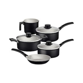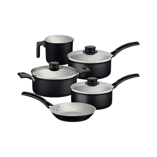 É adequado para lava-louças: Sim | Marca: Tramontina | Modelo: Turim | Com revestimento antiaderente: Sim | Peças incluídas: 5 peças | Material do cabo: Baquelite | Fonte do produto: Nacional | Linha: Turim | Quantidade de peças: 5 | Condição do item: Novo | Materiais: Alumínio Cor: Preto
