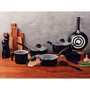 O jogo de panelas Tramontina Turim em alumínio com revestimento interno e externo em antiaderente Starflon Max preto 6 peças é a escolha ideal para você que está em busca de itens que garantam maior praticidade e versatilidade em sua rotina na cozinha. Produzidas em alumínio com espessura que proporciona cozimento rápido e uniforme dos alimentos e revestimento interno e externo de antiaderente Starflon Max, suas peças evitam que os alimentos grudem, a tornam fácil de limpar, mais durável e não prejudicial à saúde. A panela e a caçarola vem com tampa de vidro temperado com borda de aço inox e cabos, alças e pegadores em material antitérmico, que não aquecem e oferecem e conforto durante o manuseio. Todas as peças podem ir à maquina de lavar louças e vai facilitar seu dia a dia na cozinha!