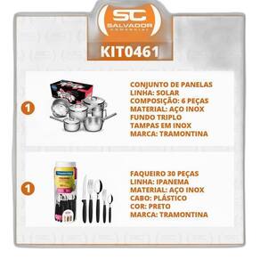 Componentes do kit:1 - jogo de panelas com fundo triplo corpo e tampa em inox 6 pçs - solar - tramontinacód. 655102001 un - panela 1,4 litro solar11,3cm a x 18cm l x 33,3cm pdiâmetro: 16cmref. 625011601 un - caçarola rasa 4,7l litros solar16,5cm a x 26,3cm l x 33cm pdiâmetro: 24cmref. 625032401 un - caçarola funda 3,6l litros solar16,8cm a x 22,1cm l x 27,5cm pdiâmetro: 20cmref. 625042001 un - cozi-vapore 3,2 litros solar10,5cm a x 22,1cm l x 27,6cm pdiâmetro: 20cmref. 625102001 un - frigideira s/ tampa 2,20 litros allegra8,1cm a x 22,2cm l x 39,6cm pdiâmetro: 20cmref. 626502001 un - fervedor 1,40 litro allegra Não recomenda-se uso em fogão de indução.13,1cm a x 13,1cm l x 17,2cm pdiâmetro: 12cm ref. 62664120- material: aço inox- tampas com encaixe perfeito e saída de vapor- fundo triplo: aço inox + alumínio + aço inox - cozimento rápido com distribuição de calor uniforme- economia de tempo e energia- as alças de inox aquecem durante o cozimento. Aconselhamos o uso de luvas durante o manuseio.- pode ir ao forno em temperatura máxima de 260c- capacidade volumétrica máxima de cozimento é 3/4 da capacidade total da peçapeso líquido do conjunto: 5,80 kgpeso bruto do conjunto: 6,70 kg1 - faqueiro facas talheres ipanema 30pç tramontina 23398/088descrição ficha técnica:modelo ipanema 30 peças.Cód. 23398/088 cor preta.Uso seguro e adequado:- antes da primeira utilização, lave bem as peças e seque-as.- produtos cortantes e perfurantes, tenha cuidado e mantenha sempre fora de alcance das crianças.- para maior durabilidade dos produtos, recomenda-se secar bem antes de guardar, mesmo após lavagem em máquinas.- para descarte dos produtos e embalagem, siga as orientações de reciclagem vigentes.Conteúdo:6 facas lâmina 11,2cm - medida 21cm6 garfos de mesa. - medida 19cm6 colheres de mesa. - medida 19cm6 garfos para sobremesa. - medida 14cm6 colheres para chá. - medida 14cm- lâmina em aço inox, maior resistência a desgaste por fricção, raspagem.- fácil manuseio e limpeza sempre cuidando com navalha e pontas .- 30 pç por embalagem.Peso líquido: 0,95 kgpeso bruto: 1,05 kgespecificação da embalagem do kit:peso bruto: 7,75 kgmedida embalagem: 23cm a x 40cm l x 57cm p.