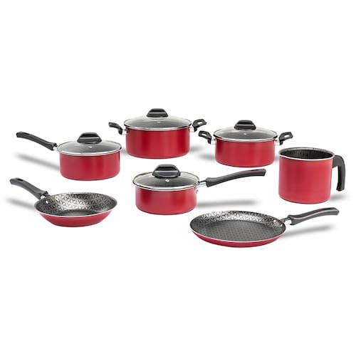 Os cabos e alças em baquelite antitérmico oferecem segurança no manuseio. As tampas em vidro temperado com borda metálica e saída para vapor facilitam o monitoramento do preparo. O acabamento interno grafite com padronagem inspirada no anis-estrelado e o exterior em tom Borgonha agregam personalidade e modernidade à cozinha.