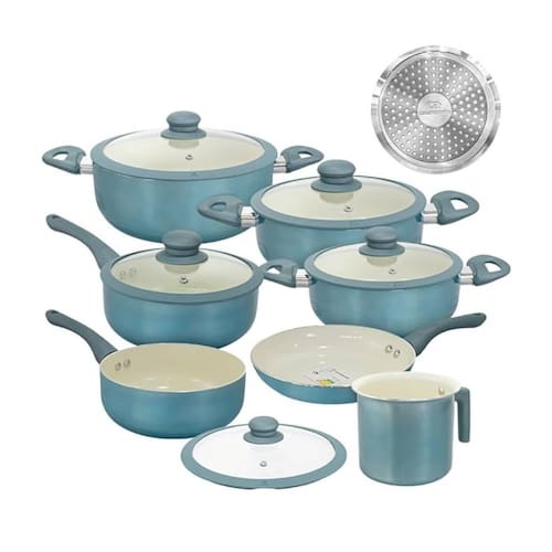 - Alumínio com revestimento cerâmico - Tampas de vidro temperado com bordas em silicone - Cabos e alças siliconadas - Cor: Parte externa azul metalizado e parte interna creme - Espessura 2,5mm