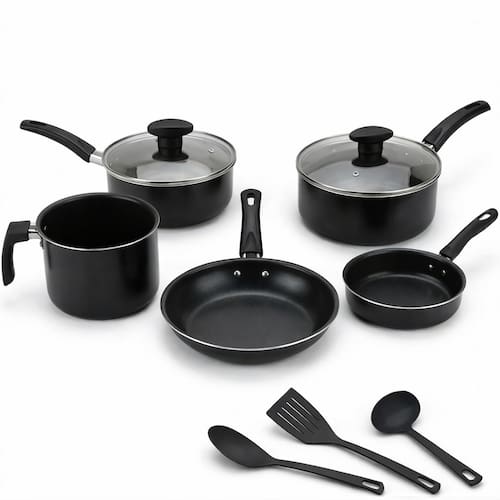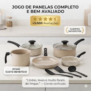 O conjunto inclui ainda uma panela de pressão de 2 litros, ideal para receitas rápidas, e utensílios em nylon, que não danificam o revestimento das panelas.