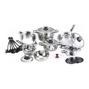 Este conjunto conta com 23 peças, incluindo caçarolas, frigideira, panela vaporizadora, fritadeira e muito mais.