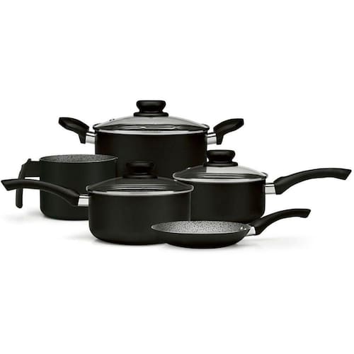 O Conjunto de panelas alumínio 5 pcs antiaderente Preto Maximum Stone, com 5 peças, é ideal para preparar todos os tipos de refeições, desde um café da manhã rápido até um jantar sofisticado.