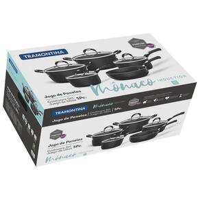 Jogo de Panelas Tramontina Mônaco Induction Antiaderente Starflon Premium Preto 5 PeçasLeve o melhor da Tramontina para sua casa com o Jogo de Panelas Tramontina Mônaco Induction 5 Peças! Ele tem peças com corpo produzido em alumínio com espessura especial e revestimento interno e externo é antiaderente Starflon Premium, atributos que cozinham o alimento de maneira uniforme e evitam que eles grudem em sua superfície. Suas panelas e caçarola acompanham tampa de vidro temperado com borda de aço inox e saída de vapor que auxilia no preparo dos alimentos e facilita a visualização. Os cabos, alças e pegadores metálicos contam com proteção de silicone que reduz a propagação de calor, proporcionando um manuseio muito mais seguro e confortável. A escolha perfeita para transformar sua rotina na cozinha!Características:1 Panela: Diâmetro: 20 cm | Capacidade: 2,6 Litros | Espessura: 3 mm1 Panela: Diâmetro: 18 cm | Capacidade: 2 Litros | Espessura: 3 mm1 Frigideira: Diâmetro: 24 cm | Capacidade: 2,7 Litros | Espessura: 3 mm1 Caçarola: Diâmetro: 24 cm | Capacidade: 4,5 Litros | Espessura: 3 mm1 Caçarola: Diâmetro: 22 cm | Capacidade: 3,5 Litros | Espessura: 3 mmEspecificações:Marca: TramontinaMaterial: AlumínioRevestimento: Antiaderente Starflon PremiumMaterial Tampa: Vidro TemperadoPeso Bruto: 7,98 kgDimensões da Embalagem: 56,2 cm C x 33,5 cm L x 27,5 cm A Observação: Objetos decorativos que aparecem nas imagens, não acompanham o produto. Imagens meramente ilustrativas.