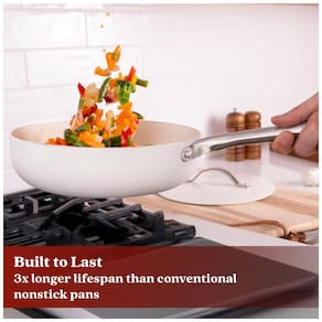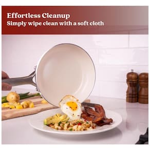 A superfície antiaderente de cerâmica reforçada com partículas de diamante do Conjunto de Panelas Alva Mobi dura 3 vezes mais do que as panelas de cerâmica comuns, resistindo a riscos e evitando descamação. Com melhor liberação de alimentos do que as concorrentes, a limpeza é fácil com água e sabão. As panelas possuem base de alumínio de calibre pesado com placa de indução de aço magnético, proporcionando aquecimento uniforme em todas as superfícies. Este conjunto completo em Canoli Cream inclui frigideiras, caçarolas e panelas, cobrindo 95% das tarefas na cozinha. As alças ergonômicas garantem conforto durante o uso. Livre de toxinas e seguro para lava-louças, o conjunto Alva Mobi oferece desempenho sem comprometer o meio ambiente. Prepare refeições perfeitamente antiaderentes sem a necessidade de pré-aquecimento, enquanto desfruta da facilidade de limpeza e durabilidade.