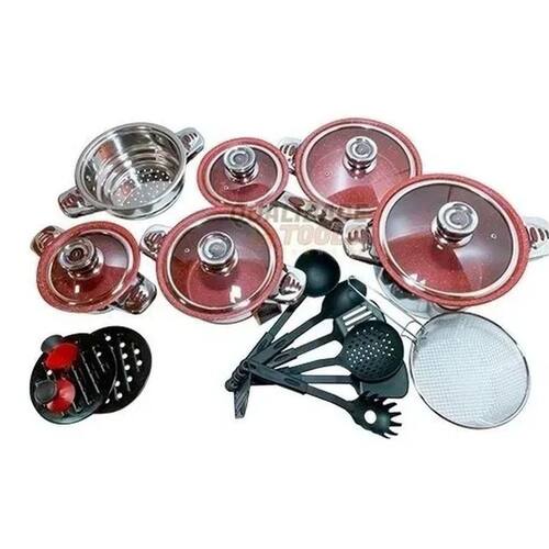 Jogo De Panelas ANTIADERENTE - Aço Cirúrgico 23 Peças - Luxo Jogo com 23 peças. Fabricação alemã com certificado de mundial. As peças são em aço cirúrgico com tampa de vidro temperado, fundo em 9 camadas com revestimento cerâmico e antiaderente. Todas as tampas são equipadas com termômetro / termostato. Aço inoxidável 18/10. Relação das peças: 1 Caçarola 6,5 litros medindo 24cmX14cm com tampa de vidro temperado 1 Caçarola 3,0 litros medindo 20cmX10cm com tampa de vidro temperado 1 Caçarola 1,6 litros medindo 16cmX8cm com tampa de vidro temperado 1 Frigideira 3,05 litros medindo 24cmX6,5cm com tampa de vidro temperado 1 Panela 1,6 litros medindo 16cmX9cm com tampa de vidro temperado 1 Panela vaporizadora medindo 20cmX10cm sem tampa 1 Fritadeira medindo 18cm 1 Bacia para misturas medindo 20cmX6cm com tampa plástica 2 Suporte de panelas em bakelite 1 Conjunto de utensílios de cozinha com 6 peças em nylon 1 Botão de sucção Acompanha ainda um livro de receitas escrito em 3 línguas Alemão, Inglês e Russo , além de um Cartão de Certificação da fábrica. Peso aproximado do conjunto é de 11,5Kgs. Temos uma linha inteira de ferramentas e Maquinas com os melhores preços do Brasil. Temos todos tipos de ferramentas para construção e decoração. São Mais De 300 Tipos de Ferramentas. Contra Defeitos de Fabricação Atendemos todo o Brasil Marca: Não Informado