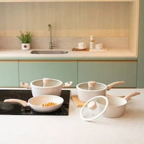 Jogo de panelas com revestimento antiaderente ceramic life e acabamento vanilla, combinando estilo contemporâneo com desempenho superior para diversas técnicas culinárias.
