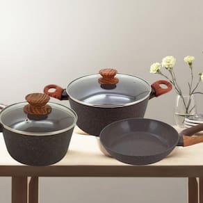 A linha mármol cook possui 3 camadas, 2 camadas de revestimento cerâmico e 1 camada resistente a alta temperatura. Com estrutura de alumínio as panelas possuem 4mm de espessura que proporciona uma maior durabilidade do produto, como também mais uniformidade térmica, cozinhando os alimentos de maneira uniforme, sem variações de temperatura. Sem contar que elas também mantêm o calor por mais tempo mesmo fora do fogo, possibilitando refeições aquecidas até mesmo à mesa. Com revestimento soft-touch, toque super macio, em seus cabos e alças, confortável ao segurar e previne queimaduras. Disponível em 2 cores, com estética diferente para todos os gostos.