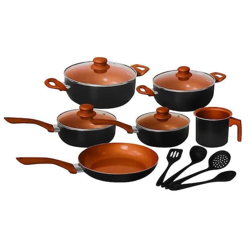 Composto por 1 frigideira, 1 leiteira, 2 panelas, 2 caçarolas, 1 escumadeira, 1 espátula, 1 colher arroz e 1 spoon (utensílios em silicone preto rígido)