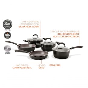 Jogo De Panelas Antiaderente-indução-ceramic Select 5 Pçs Carbono Brinox Jogo de Panelas Cinza Carbono Antiaderente com Fundo de Indução Brinox Ceramic Life Select 5 peçasToda cozinha bem equipada precisa de um conjunto de panelas completo que favoreça uma alimentação saudável. O Jogo de Panela de cerâmica Ceramic Life Select conta com exclusivo fundo de indução para você passar menos tempo preparando suas receitas e cozinhando de forma mais segura em todos os tipos de fogões! Com a tecnologia Antiaderente Mineral Resist com partículas de cerâmica, as Woks, frigideiras, panquequeiras e grills são ultra resistente a altas temperaturas, livres de metais pesados e elementos químicos prejudiciais à saúde, exigindo menos uso de óleo no preparo das refeições, além de não deixar os alimentos grudarem. Facilitando a limpeza e consumindo menos energia com o antiaderente Pro Ceramic Premium. As tampas em vidro temperado, que têm saída para o vapor, permitem que você acompanhe o preparo das receitas, além de alças em revestimento Soft-Touch fornecem segurança.Certificação compulsória certificada pelo OCP 0003, registros 003900/2020 e 003899/2020 e classificação de antiaderência A (ótima), conforme Portaria Inmetro 499/2021. Material - Alumínio Linha - Ceramic Life Select Composição - Jogo de Panelas Cinza Carbono Antiaderente com Fundo de Indução Brinox Ceramic Life Select 5 peças -01 Caçarola com Tampa - Diâmetro: 24 cm | Altura: 11 cm | Capacidade: 4,3 L;-01 Caçarola com Tampa - Diâmetro: 20 cm | Altura: 9 cm | Capacidade: 2,3 L;-01 Panela com Tampa - Diâmetro: 18 cm | Altura: 8 cm | Capacidade: 1,7 L;-01 Frigideira - Diâmetro: 20 cm | Altura: 4,5 cm | Capacidade: 1 L;-01 Wok - Diâmetro: 24 cm | Altura: 7 cm | Capacidade: 2,3 L. Espessura - 3.2mm Garantia - 90 dias para vícios e defeitos de fabricação. Instruções de Uso - Conteúdo Especial -