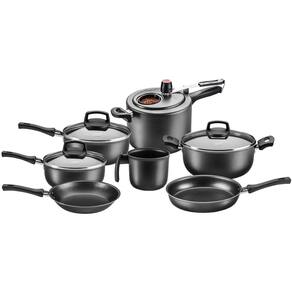 Para tornar sua cozinha mais moderna, elegante e simplificar as atividades culinárias, apresentamos o conjunto de panelas MTA, composto por 7 peças. Elaboradas com material de excelente qualidade, são ideais para aqueles que buscam a união de estilo e praticidade. Contam com um revestimento antiaderente de 5 camadas, permitindo cozinhar com pouco óleo. Proporcionam uma maior eficiência antiaderente, maior resistência à abrasão, maior durabilidade e são de fácil limpeza. Além disso, são livres de PFOA e possuem uma resistência comprovada de mais de 5.000 ciclos. Características: Marca: MTA Código do Fabricante: 9811 Linha: Gourmet Cor: Grafite Material: Alumínio Material dos cabos/pegadores: Baquelite antitérmico Espessura: 1.2mm Fogões Compatíveis: Gás, elétrico e vitrocerâmico Conteúdo: Fervedor 12cm 1.2L, Frigideira reta 20cm 1.1L, Frigideira francesa 18cm 0.7L, Panela de pressão 4.5L, Panela 16cm 1.4L, Panela 18cm 1.7L e Caçarola 20cm 2.4L Compatível com lava-louças: Sim Material das Tampas: Vidro temperado Saída de Vapor: Sim