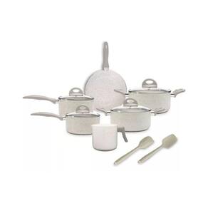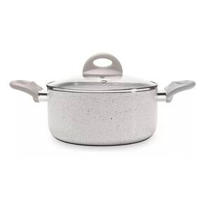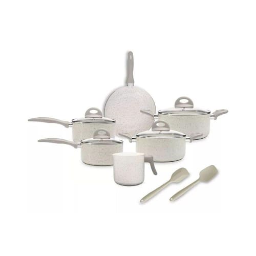 ESPECIFICAÇÕES TÉCNICAS: o Conjunto de Panelas é composto por Caçarola com Tampa Ø 24x11,5cm - 4,55 L; Caçarola com Tampa Ø 20x9,5 cm – 2,55 L; Panela com Tampa Ø 18x9,2 cm - 2,1 L; Panela com Tampa Ø 16x8,2 cm - 1,4 L; Wok Ø 24 cm – 2,65 L; Fervedor Ø 12x11,8 cm - 1,25 L; 1 colher e 1 espátula. As panelas, em alumínio, possuem antiaderente cerâmico Pro-Ceramic e Mineral Resist. As tampas são em vidro temperado. Os cabos, alças e poméis são em baquelite com acabamento soft-touch. Cor Vanilla.