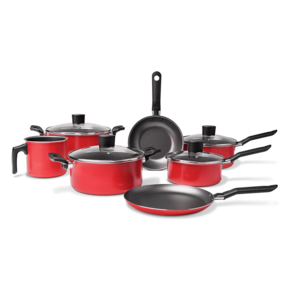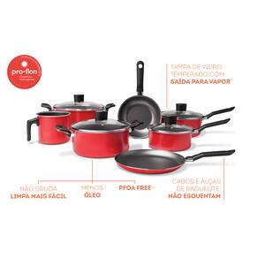 Sua cozinha merece o mais funcional e compacto conjunto de panelas do Brasil, o Jogo 7 panelas Brinox Garlic vermelho antiaderente pro-flon com tapioqueira. O Jogo de panelas 7 peças Garlic possui estrutura em alumínio, cozinha por igual e muito rápido, consumindo menos energia. Seu revestimento antiaderente pro-flon não deixa o alimento grudar, facilita a limpeza e é livre de metais pesados e elementos prejudiciais a saúde (PFOA free). Como todo produto de qualidade Brinox, possui classificação A no Inmetro. É composto por 1 caçarola de 22 cm, 1 caçarola de 20 cm, 1 panela de 18 cm, 1 panela de 16 cm, 1 tapioqueira de 22 cm, 1 fervedor de 12 cm e uma frigideira de 18 cm. O conjunto, funcional, prático e de grande resistência pode ser utilizado nos fogões à gás (comum), vitrocerâmico e elétrico, com a mesma durabilidade e eficiência. A linha Garlic possui corpo de 1,2 mm de espessura em alumínio com pintura antiaderente garantindo a durabilidade do produto. Seus cabos, alças e puxadores são feitos em baquelite, não esquentam e proporcionam um toque confortável e ergonômico das panelas. Suas tampas são de vidro temperado com bordas em aço inox e saída de vapor, facilitando a visibilidade durante o cozimento. A Brinox está sempre inovando e pensando no melhor para as suas panelas sejam elas comuns ou de pressão, além dos demais utensílios de apoio ao seu dia a dia. Afinal, você merece os produtos Brinox na sua casa!