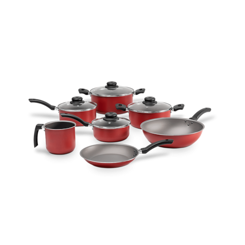 Com estrutura em alumínio que cozinha por igual e mais rápido, tampas de vidro temperado, com saída para vapor e cabos e alças de baquelite que não esquentam, o conjunto de panelas 7 peças da linha Ruby possui antiaderente pro-flon que não gruda, é fácil de limpar e livre de PFOA. Como todas as panelas da Brinox, a linha Ruby possui Classificação A no Inmetro. Disponível na cor preta, uma das cores mais versáteis e práticas para a cozinha, a linha Ruby é uma ótima opção para o dia a dia pois se encaixa bem tanto em ambientes sofisticados quanto nos mais mais simples. Esse conjunto é composto por: Caçarola com Tampa Ø 22 x 10 cm - 3,45 L, Caçarola com Tampa Ø 20 x 9 cm - 2,6 L, Panela com Tampa Ø 18 x 8 cm - 1,9 L, Panela com Tampa Ø 16 x 7 cm - 1,3 L, Wok Ø 26x8 cm - 3 L, Frigideira Ø 22 x 3,5 cm - 0,8 L, Fervedor Ø 12 x 11,5 cm.