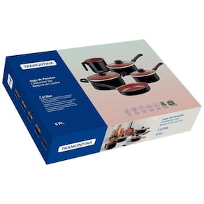 Complete sua cozinha com o jogo de panelas Tramontina Caribe com revestimento interno em antiaderente Starflon Max e externo de poliéster preto 05 peças. Ideal para preparar suas refeições diárias, ele tem peças produzidas em alumínio com espessura que proporciona o cozimento rápido e uniforme dos alimentos. Externamente elas são revestidas em poliéster e internamente em antiaderente Starflon Max, material que evita que os alimentos grudem em sua superfície. As panelas e a caçarola vem com tampas de vidro temperado com borda de aço inox que facilitam a visualização dos alimentos e facilitam o preparo. Os cabos, alças e pegadores são em materiais antitérmicos e oferecem maior segurança durante o manuseio!