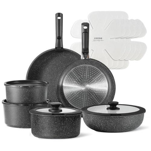 Desfrute de uma solução de armazenamento otimizada e empilhamento fácil com as panelas e frigideiras CAROTE com alça removível, economizando até 70% mais espaço. Limpeza sem esforço graças à capacidade antiaderente. 1 único processo de limpeza para todo o conjunto de panelas, que pode ser utilizado tanto na cozinha quanto na mesa. Alça removível permite transição suave do fogão para o forno, grelha, geladeira e mesa. Versão aprimorada garante segurança durante o uso. Possui transferência de calor rápida e uniforme, além de desempenho antiaderente excepcional. Conjunto inclui frigideiras , panelas, caçarola , tampa de silicone , tampa de armazenamento de geladeira , 2 alças removíveis e 5 protetores de panela.