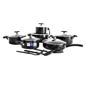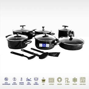 Conjunto de Panelas 6 Peças Aço Fundido com Cerâmica e Tampa de Vidro inquebrável Preta - RoyaleSua Cozinha merece produtos de alta QualidadeO Conjunto possui revestimento especial em vitro cerâmica, confeccionada para resistir as temperaturas e evitar contaminação por germes e bactérias.Cozinha eficientemente e mantém o calor economizando até 40% do gás.Fácil de Limpar e permanecem bonitas por mais tempo.Material: Aço Ferromagnético Fundido a 850.C com Cerâmica de Alta Qualidade.Pode ser levado ao Freezer, Lava Louças, Fogão A Gás, Elétrico, por Indução e a Lenha.Composição:1 Caçarola com tampa de vidro 25cm1 Caçarola com tampa de vidro 22cm1 Frigideira com tampa de vidro 24cm1 Panela com tampa de vidro 18cm1 Panela com tampa de vidro 20cm1 Leiteira com tampa de vidro 16cmCaracterísticasAmbiente: CozinhaModelo / Tipo: Conjunto de PanelasMedida Externa (AxLxP):23.5x40.5x66cmMaterial: Aço, CerâmicaCor: PretoCabo: BaquelitePeso: 5klsTipo de Uso: Dia a DiaQuantidade de Peças: 6 mais 3 escumadeiras 9 peças totalGarantia: Defeito de FabricaçãoDicas de uso para suas panelas, lembrando que as panelas não são antiaderentes. As panelas são de aço e revestidas de cerâmica, obtendo uma economia de gás, pois prepara rapidamente os seus alimentos e os mantêm aquecidos por até 30 minutos após a sua finalização. Elas são atóxicas, isto é, elas não soltam resíduos nocivos no seu alimento, nenhum tipo de resíduo prejudicial à sua saúde é liberado no preparo de seu alimento. Atende todos os tipos de fogões (indução, cooktop, fogão elétrico vitrocerâmico, fogão à lenha e fogões convencionais). Instruímos aos nossos clientes, o uso do fogo baixo para preparo de suas refeições, para que não ocorra o risco de queimá-las. Modo de limpar:A limpeza deve ser feita exclusivamente com esponjas que não riscam, se necessário, ferva uma pequena quantidade de água e detergente para facilitar a limpeza.