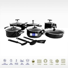 Conjunto de Panelas 6 Peças Aço Fundido com Cerâmica e Tampa de Vidro inquebrável Preta - RoyaleSua Cozinha merece produtos de alta QualidadeO Conjunto possui revestimento especial em vitro cerâmica, confeccionada para resistir as temperaturas e evitar contaminação por germes e bactérias.Cozinha eficientemente e mantém o calor economizando até 40% do gás.Fácil de Limpar e permanecem bonitas por mais tempo.Material: Aço Ferromagnético Fundido a 850.C com Cerâmica de Alta Qualidade.Pode ser levado ao Freezer, Lava Louças, Fogão A Gás, Elétrico, por Indução e a Lenha.Composição:1 Caçarola com tampa de vidro 25cm1 Caçarola com tampa de vidro 22cm1 Frigideira com tampa de vidro 24cm1 Panela com tampa de vidro 18cm1 Panela com tampa de vidro 20cm1 Leiteira com tampa de vidro 16cmCaracterísticasAmbiente: CozinhaModelo / Tipo: Conjunto de PanelasMedida Externa AxLxP :23.5x40.5x66cmMaterial: Aço, CerâmicaCor: PretoCabo: BaquelitePeso: 5klsTipo de Uso: Dia a DiaQuantidade de Peças: 6 mais 3 escumadeiras 9 peças totalGarantia: Defeito de FabricaçãoDicas de uso para suas panelas, lembrando que as panelas não são antiaderentes. As panelas são de aço e revestidas de cerâmica, obtendo uma economia de gás, pois prepara rapidamente os seus alimentos e os mantêm aquecidos por até 30 minutos após a sua finalização. Elas são atóxicas, isto é, elas não soltam resíduos nocivos no seu alimento, nenhum tipo de resíduo prejudicial à sua saúde é liberado no preparo de seu alimento. Atende todos os tipos de fogões indução, cooktop, fogão elétrico vitrocerâmico, fogão à lenha e fogões convencionais . Instruímos aos nossos clientes, o uso do fogo baixo para preparo de suas refeições, para que não ocorra o risco de queimá-las. Modo de limpar:A limpeza deve ser feita exclusivamente com esponjas que não riscam, se necessário, ferva uma pequena quantidade de água e detergente para facilitar a limpeza.