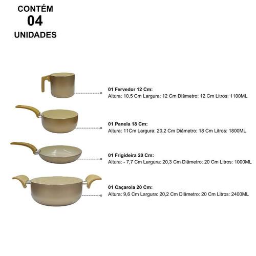 01 fervedor 12 cm: ideal para líquidos, chás e pequenas porções. Capacidade: 1100 ml. 01 panela 18 cm: perfeita para molhos, arrozes e preparos do dia a dia. Capacidade: 1800 ml. 01 frigideira 20 cm: antiaderente, ótima para omeletes, grelhados e refogados. Capacidade: 1000 ml. 01 caçarola 20 cm: versátil, excelente para sopas, ensopados e cozidos. Capacidade: 2400 ml.