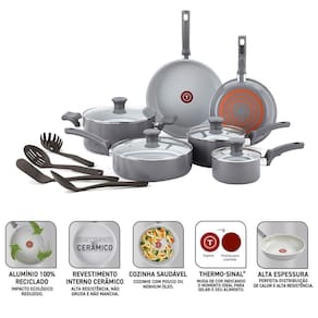 O Jogo de Panelas Cinza Recycled Ceramic Tefal de 10 Peças oferece qualidade, sustentabilidade e praticidade em um único conjunto. Com o revestimento antiaderente cerâmico avançado e a tecnologia Thermo-Sinal, você terá resultados incríveis em todas as suas preparações culinárias. A composição diversificada do conjunto oferece opções versáteis para todas as suas necessidades. E, claro, a compatibilidade com lava-louças garante uma limpeza fácil e sem esforço.