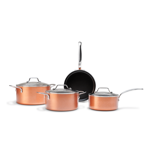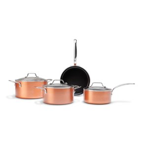 Cozinhe seus alimentos em menos tempo, prepare suas receitas em qualquer tipo de fogão e reduzia seus gastos, com o exclusivo fundo de indução do conjunto de panelas 4 peças da linha Copper da Brinox. Com estrutura em alumínio que cozinha por igual e mais rápido, tampas de vidro temperado, com saída para vapor, cabos e alças em aço inox rebitados, o conjunto conta ainda com antiaderente pro-flon premium,que, além de ser mais resistente, não gruda, é fácil de limpar e livre de PFOA. Como todas as panelas da Brinox, a linha Copper possui Classificação A no Inmetro. Seu acabamento martelado, unido a cor cobre, transforma sua cozinha em um ambiente moderno e sofisticado. O conjunto é composto por Frigideira Alta Ø 24cm, Panela Ø18 cm, Caçarola Ø20 cm, Caçarola Ø 24 cm.