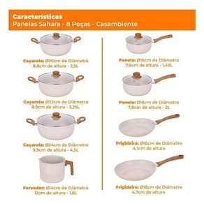 Jogo de panelas antiaderente revestimento cerâmica vanilla sahara 9 peças - casambiente al177 possui revestimento antiaderente em cerâmica e 2,0mm espessura em sua estrutura, o que melhora o preparo de seus alimentos, pois a temperatura é dissipada de maneira uniforme e favorece o cozimento, evitando que sua comida queime facilmente. 1 caçarola 24cm 1 caçarola 22cm 1 caçarola 20cm 1 panela 18cm 1 panela 16cm 1 frigideira 18cm 1 frigideira 16cm 1 fervedor 14cm Panela 4,2l - segurança, praticidade e design Capacidade: 4,2 litros - ideal para preparos do dia a dia para a família. Revestimento: antiaderente cerâmico - fácil limpeza, preparo saudável sem grudar. Compatibilidade: funciona em todos os tipos de fogão elétrico, gás, vidro, indução - verificar se há necessidade de disco difusor . Segurança máxima: válvula de segurança e sistema de travamento automático da tampa. Conforto: cabo anatômico para manuseio seguro e firme. Design: acabamento marmorizado, moderno e sofisticado para a sua cozinha. Funcionalidade: sistema para cozimento rápido e uniforme. Perfeita para quem busca praticidade sem abrir mão da segurança e do estilo Recomendações: - lavar antes do primeiro uso, untar com óleo e aquecer antes da primeira utilização. - usar somente utensílios de madeira, silicone ou nylon. - utilizar fogo médio ou baixo, pois as panelas distribuem uniformemente o calor. - não esquentar o produto vazio. - utilizar o lado macio da esponja e evitar uso de abrasivos - indicado para fogão a gás, elétrico. Não indicado para fogão de indução