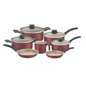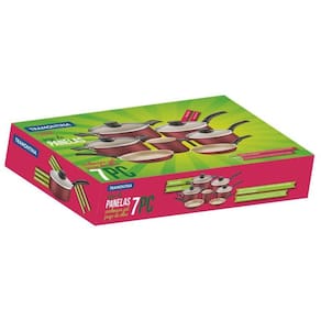 Jogo de panelas de alumínio com revestimento interno de antiaderente 7 peças Alumínio com revestimento interno e externo de antiaderente Starflon T1.Cabos e alças de baquelite antitérmico e pegadores de nylon.Tampas de vidro temperado com borda de aço inox. Recomendações de uso USO SEGURO E ADEQUADO:Ao utilizar utensilios quentes tenha cuidado redobrado. Se necessário, utilize proteção para as mãos e mantenha fora do alcance de crianças. Para sua segurança, ao utilizar utensílios com cabos, mantenha os mesmos sempre voltados para o centro do fogão. Ao utilizar seu utensílio em fogões com grade, mantenha a peça centralizada e alinhe o cabo com a grade, para reduzir o risco de queda.Para descarte dos produtos e embalagens siga as orientações de reciclagem vigentes.
