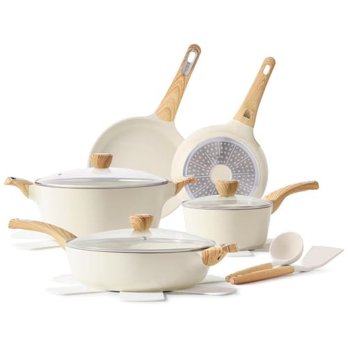 Apresentamos o Conjunto de Panelas de Cerâmica SENSARTE, a escolha saudável para a sua cozinha. Com superfície cerâmica antiaderente 100% não tóxica, livre de PFOA, PTFE, PFAS, PFOS, grafite, cádmio e outras substâncias nocivas. Seu revestimento cerâmico natural é mais saudável que o revestimento de Teflon, resistente a riscos e libera os alimentos com facilidade. Requer menos óleo para cozinhar, promovendo uma dieta saudável e com baixo teor de gordura. O conjunto inclui frigideiras , panela para refogar com tampa, caçarola com tampa, panela com tampa, 2 utensílios multiuso e 4 protetores de panela. Fácil de limpar, basta passar um papel toalha ou enxaguar com água. Compatível com indução e todos os tipos de fogões. O fundo de aço inoxidável permite aquecimento rápido e uniforme, sem deformações. Com alça StayCool e tampa de vidro resistente a explosões para cozinhar com tranquilidade.